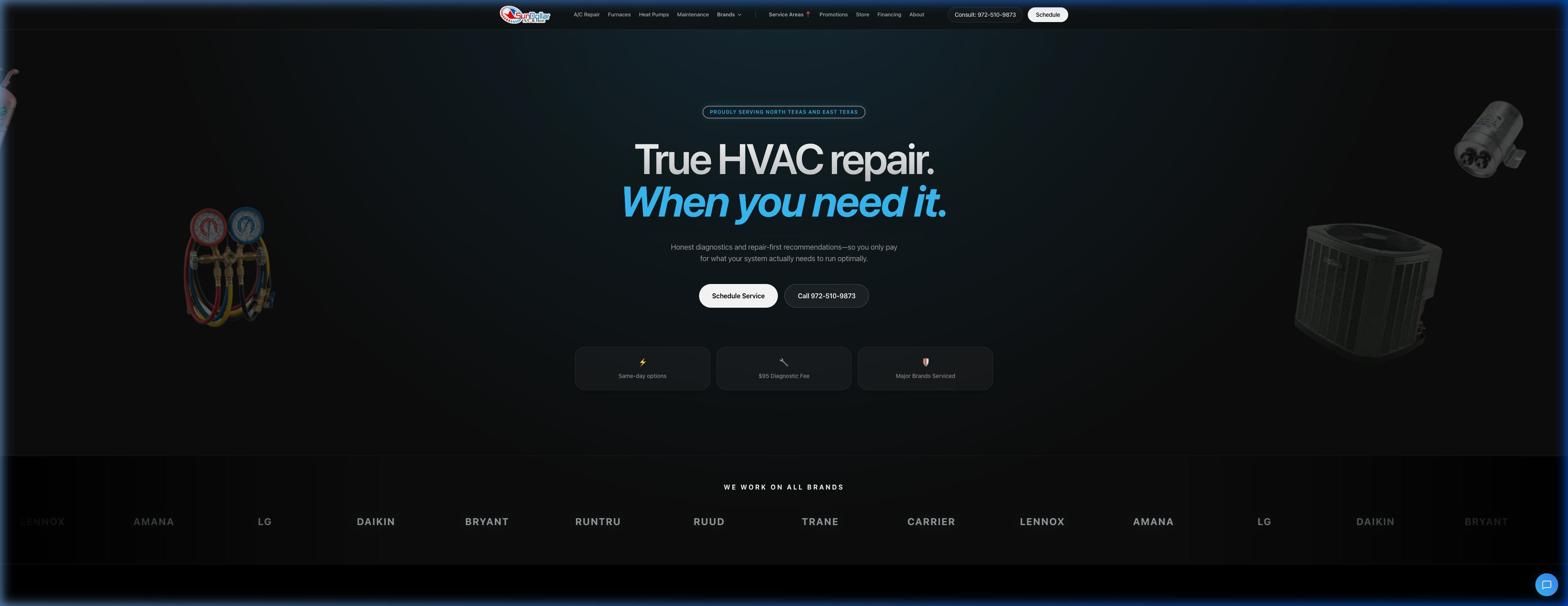 Full website build for a repair-first HVAC company across North Texas and East Texas. Custom design, scroll animations, brand logos marquee, SEO schemas, and managed hosting.